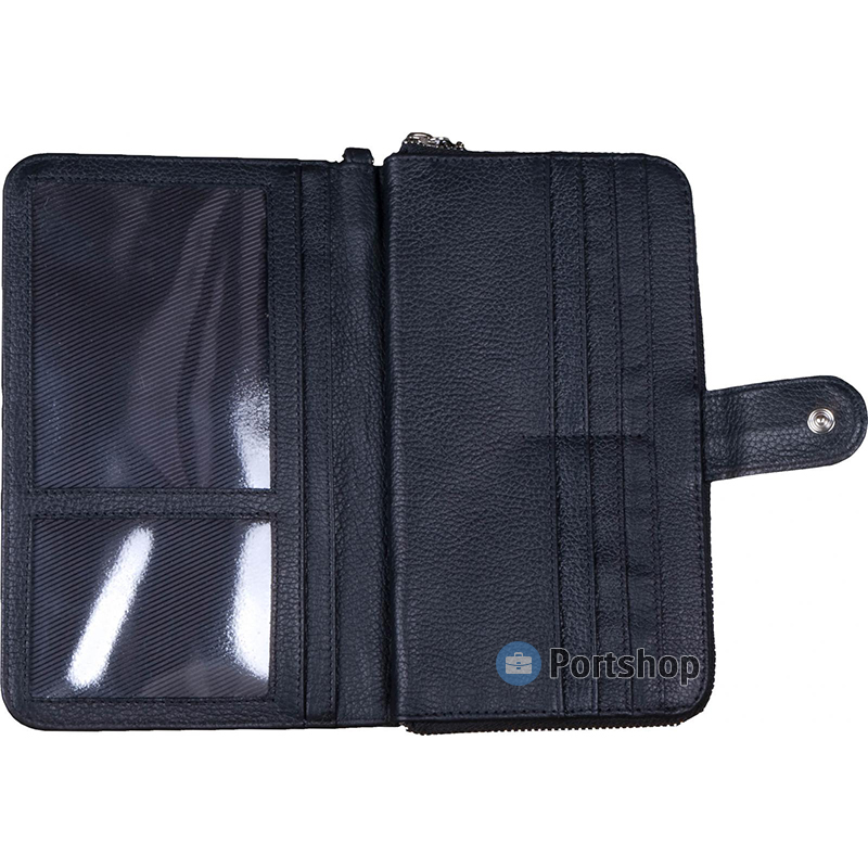 Размер: 19,5 х 11,5 х 3 см. Стильная визитка-клатч имеет внутри два отделения для купюр (закрываются на общую молнию), разделенные карманом на молнии, а также откидную планшетку (закрывается на кнопку), которая содержит восемь отделений для карт и визиток, скрытое отделение и два прозрачных окошка для документов. Клатч оснащен съемной ручкой-петлей для ношения на руке. Цвет: черный.