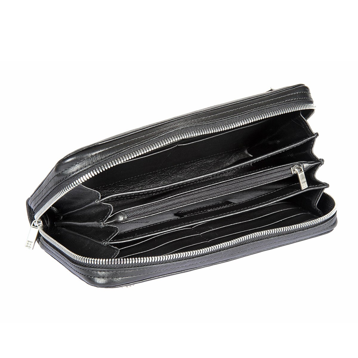 Размер: 23 х 12 х 4 см. Визитка-клатч закрывается на молнию, оснащена съемным ремнем на запястье, внутри пять больших продольных карманов один из которых на молнии, на передней и задней стенках по шесть карманов для пластиковых карт и по одному потайному карману, снаружи на передней и задней стенках карманы на молнии. Цвет: черный с красными вставками.