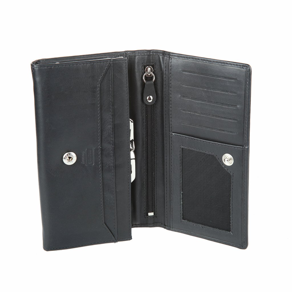 Размер: 17,5 х 10,5 х 2 см. Классический женский кошелек на полную купюру, закрывается клапаном на кнопке, внутри три отдела для купюр, карман для мелочи на оригинальном замке, пять потайных карманов, пять кармашков для пластиковых карт, сетчатое отделение для пропуска, снаружи на задней стенке отделение для мелких предметов на молнии. Цвет: черный.
