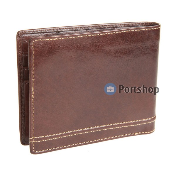 Размер: 12 х 9 х 2 см. Портмоне раскладывается пополам, внутри два отдела для купюр, карманы для пластиковых карт, один карман для мелочи (закрывается клапаном на кнопке). Цвет: коричневый.