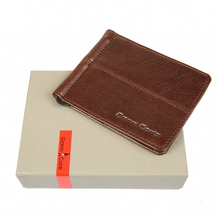 Размер: 11 х 9 х 1 см. Портмоне раскладывается пополам, внутри зажим для купюр, два кармашка, снаружи на задней стенке карман. Цвет: темно-коричневый.
