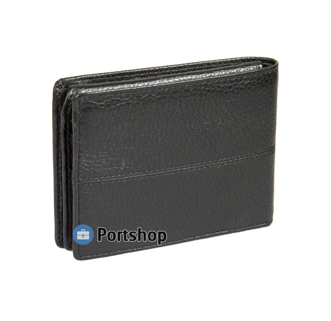 Размер: 12 x 9.5 х 3 см. Портмоне раскладывается пополам, внутри два отдела для купюр, отделение для мелочи на кнопке, потайной кармашек, сетчатый карман, семь каримашков для пластиковых карт, пять карманов для документов. Цвет: черный.