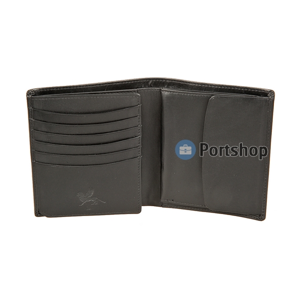 Размер: 12 х 10,5 х 3 см. Портмоне раскладывается пополам, внутри два отдела для купюр, отдел для мелочи на кнопке, потайной карман, карман для документов, десять кармашков для пластиковых карт, сетчатый карман. Цвет: черный.