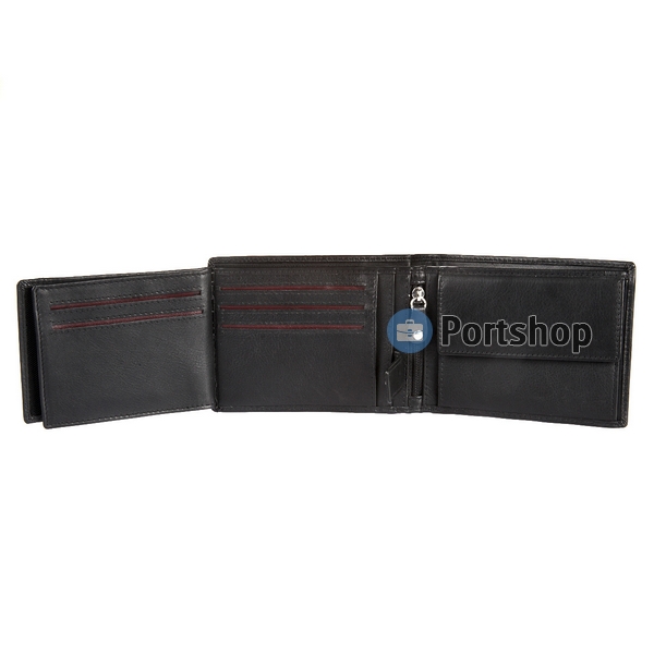 Размер: 12,5 х 9,7 х 2 см. Портмоне раскладывается пополам, внутри два отдела для купюр, восемь кармашков для пластиковых карт, четыре потайных кармана (один из них на молнии), два сетчатых отдела для пропуска, отделение для мелочи (закрывается клапаном на кнопке), снаружи отделение для мелочи (на молнии), карман для мелких предметов. Цвет: черный.