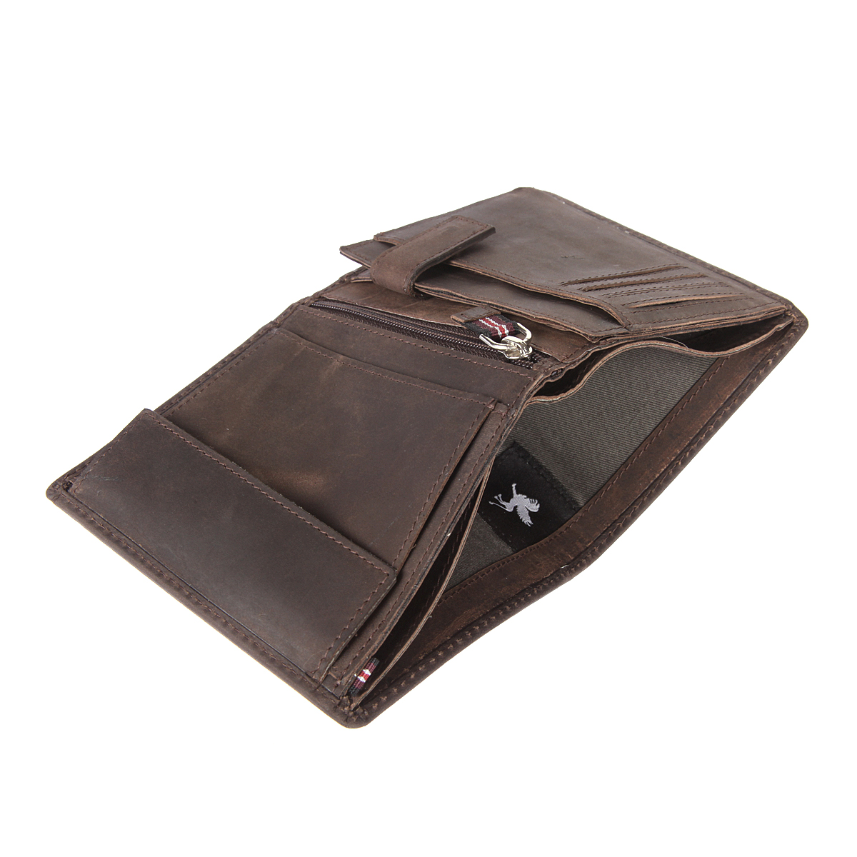 Размер: 12,5 х 10,5 х 3 см. Портмоне раскладывается пополам, внутри два отдела для купюр, отдел для мелочи на кнопке, два потайных кармана, карман на молнии, десять кармашков для пластиоквых карт, сетчатый кармашек. Цвет: коричневый.