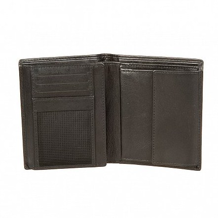 Размер: 12.5 х 10.5 x 2 см. Портмоне раскладывается пополам, внутри два отделения для купюр, семь кармашков для пластиковых карт, два сетчатых кармана, потайной карман, четыре кармана для документов, карман для монет на кнопке. Цвет: черный.