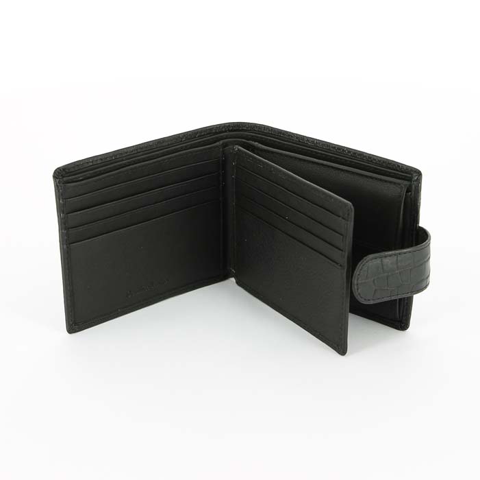 Размер: 11,5 x 9 см. Портмоне закрывается застежкой на кнопке, внутри два отделения для купюр, множество кармашков для карт и визиток, монетник на кнопке. Цвет: черный.