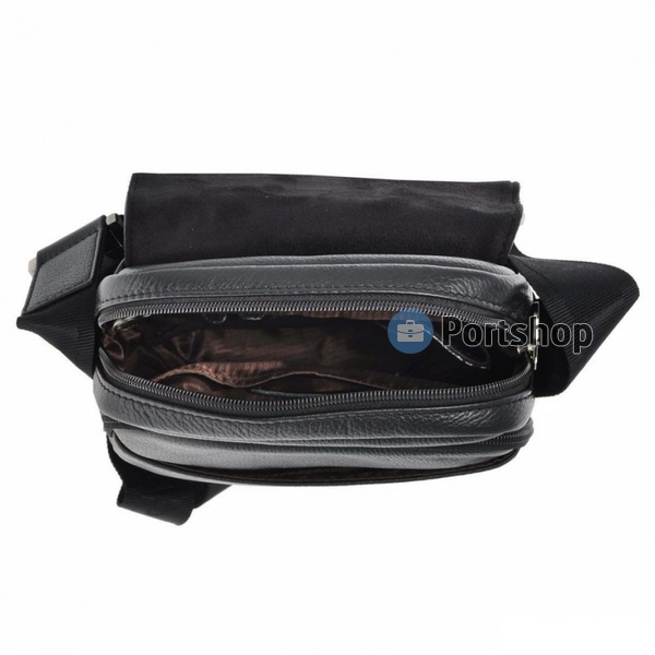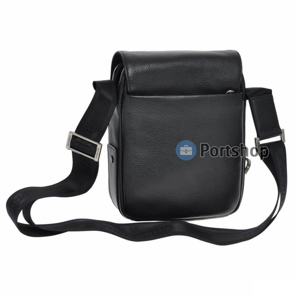 Размер: 23 х 18 х 9 см. Мужская сумка-планшет имеет спереди два накладных кармана (один на молнии), сумка закрывается двумя магнитными кнопками, внутри одно отделение, один карман на молнии и дополнительный карман для документов и кожаные кармашки для ручек, телефона и мелочей, снаружи с тыльной части накладной карман на молнии, сумка снабжена регулируемым по длине плечевым ремнем. Цвет: черный.